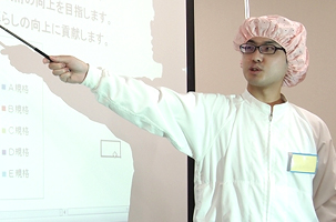 私の仕事はまず、加工課の1日の作業スケジュールを作ります。セブンイレブンに納品される商品の数は毎日違うので、日々のスケジュール作成は欠かせません。そのスケジュールを基に、加工課では約80名の従業員の方が仕事を行う為、とても責任のある仕事です。作業する人も毎日同じ人、とういうわけではないので、この作業はAさんに、この作業はBさんとCさんに、といった感じで仕事の割り振りも行います。またスケジュール通りいかなかった時に、どう修正するかも考えます。
